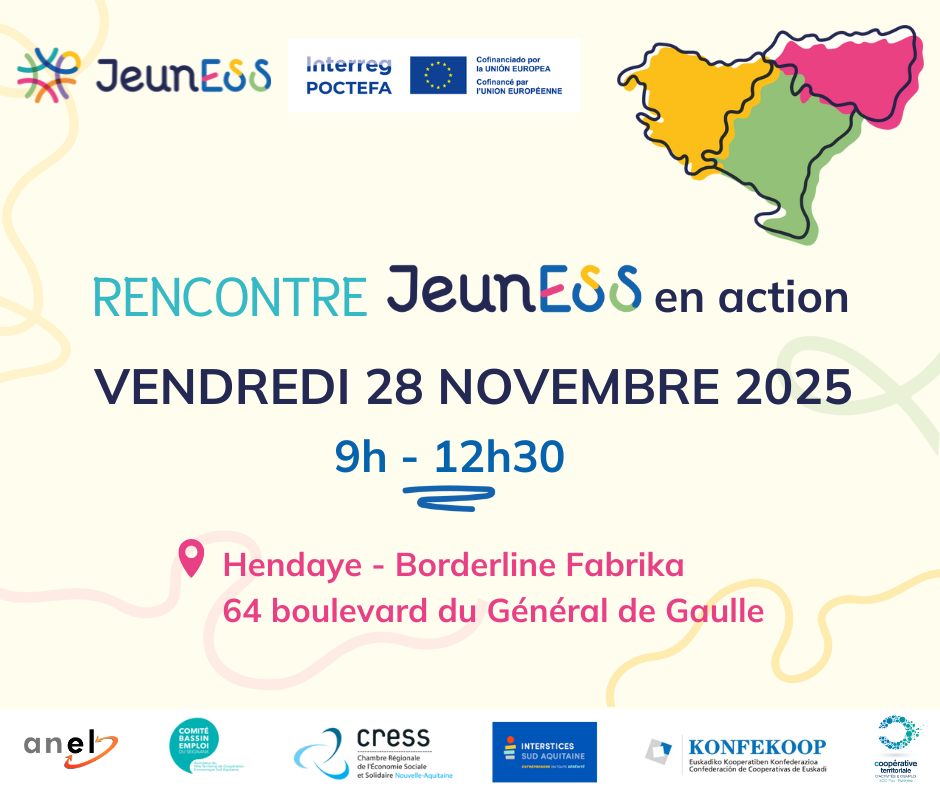Le projet JeunESS vise à promouvoir l’Économie Sociale et Solidaire (ESS) et l’entrepreneuriat coopératif afin d’améliorer l’employabilité des jeunes et de faciliter leur insertion professionnelle dans l’espace transfrontalier réunissant le Sud Aquitaine, l’Euskadi et la Navarre.